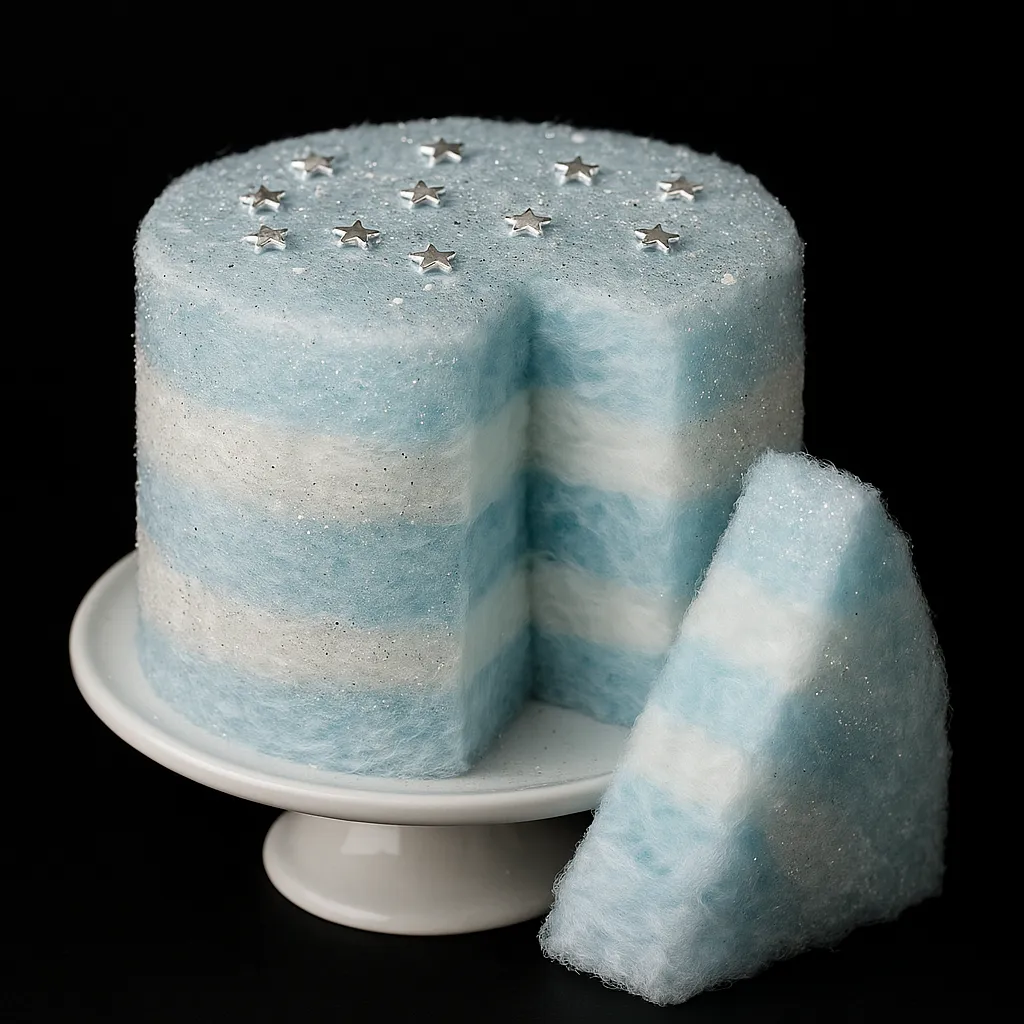 A cotton candy cake is a 9" round “cake” made entirely of hand-spun cotton candy—no baked cake layers, no frosting, no crumbs. Multiple layers of flavored cotton candy are pressed into a cake shape, so it looks like a cake but melts like cotton candy on your tongue.